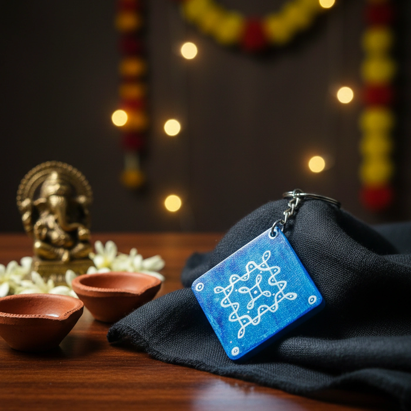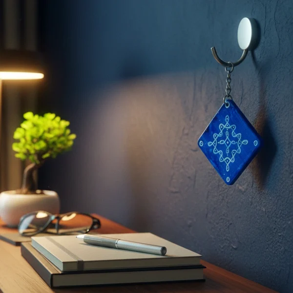 This hand-painted blue wooden keychain features a beautiful tribal geometry pattern inspired by Indian folk art.