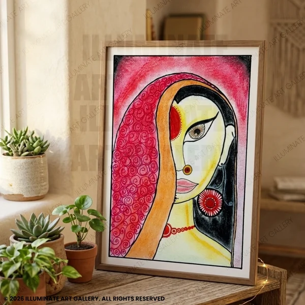 This captivating painting portrays the elegance and beauty of a Rajasthani woman. With vibrant hues, intricate details, and traditional elements like jewelry and a veil, the half-face composition symbolizes grace and cultural richness. Perfect for adding an ethnic charm to your space, this handmade artwork blends modern artistry with timeless heritage.