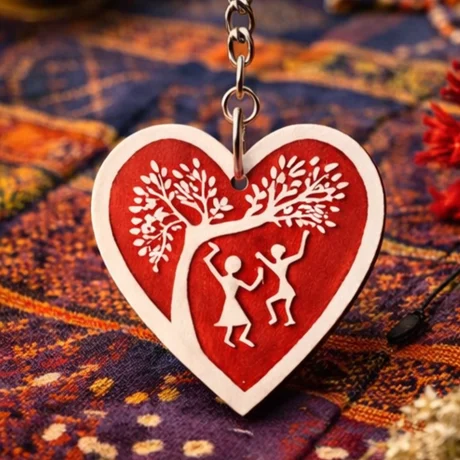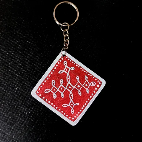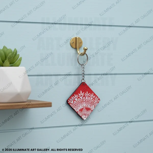 Inspired by traditional Indian mandala art, this handcrafted wooden keychain is carefully hand-painted in bold red and white tones.