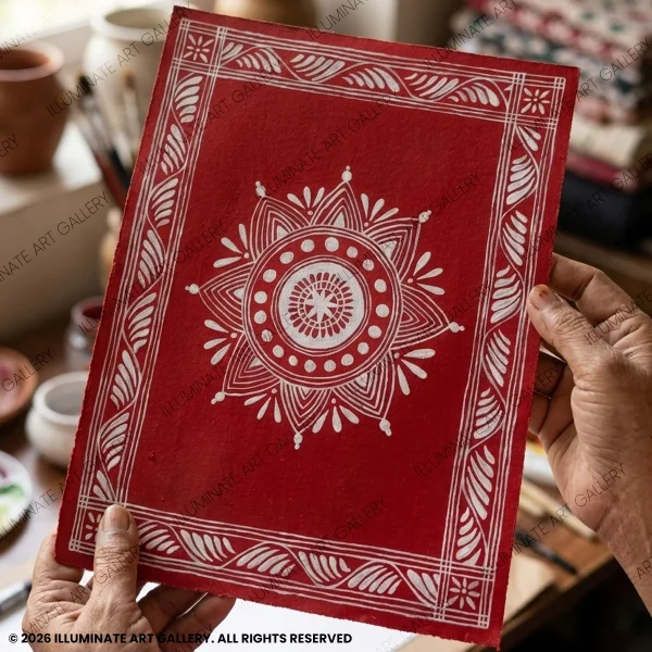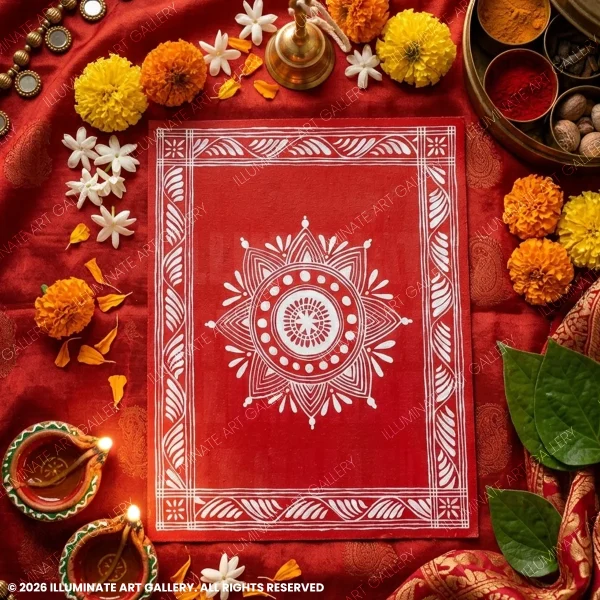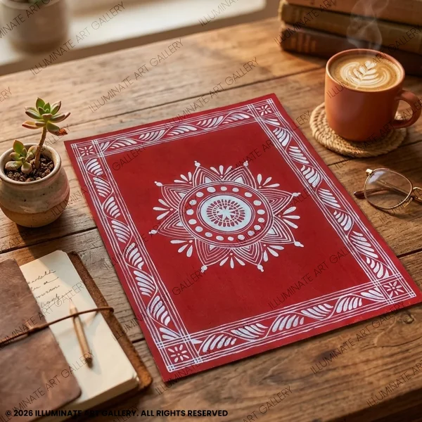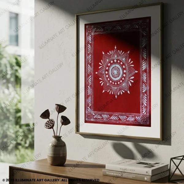 Handmade Minimal Aipan Mandala Art – Red White Canvas Wall Décor