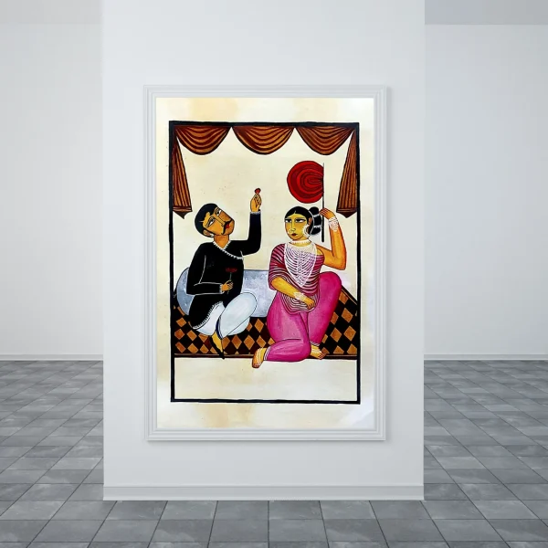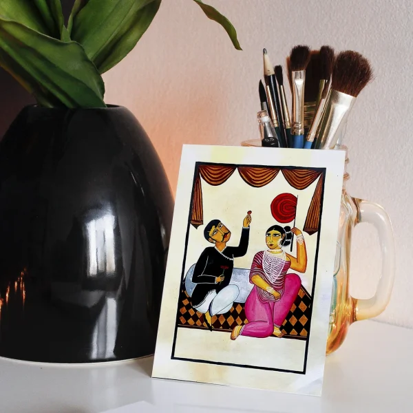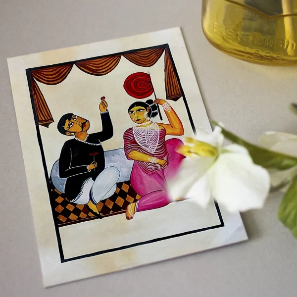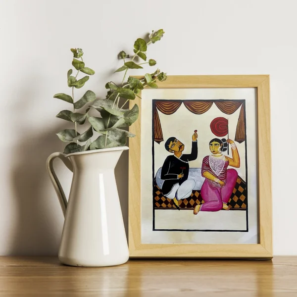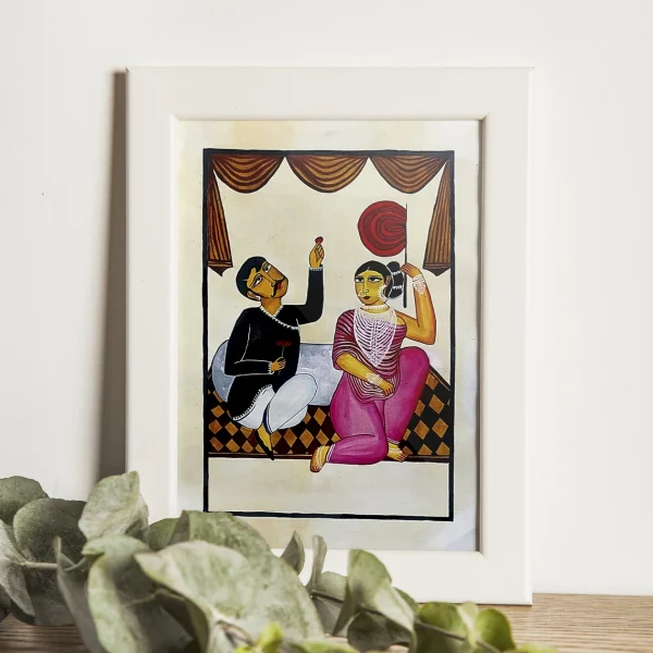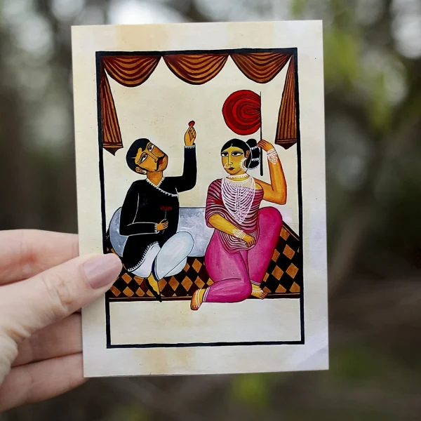 - Distinctive Style: Kalighat paintings are characterized by bold strokes, vibrant colors, and simple compositions. The use of flat, bright hues and a focus on capturing expressions and emotions contribute to the unique and eye-catching style of these artworks.