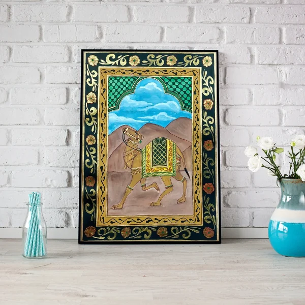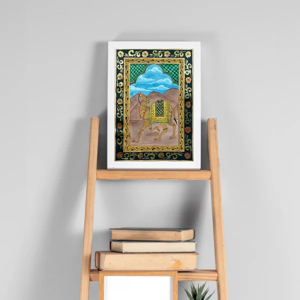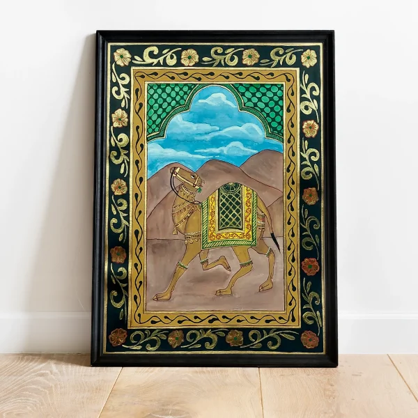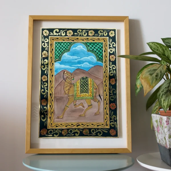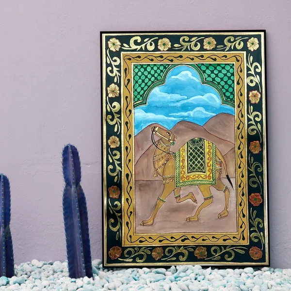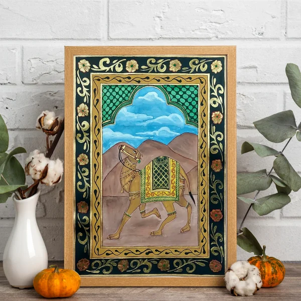 Each brushstroke reflects the patience and precision required to create this A4-sized masterpiece. The ornate details on the camel’s ornaments and textiles represent luxury, while the earthy hues complement the desert landscape, evoking a timeless Rajasthani aura.