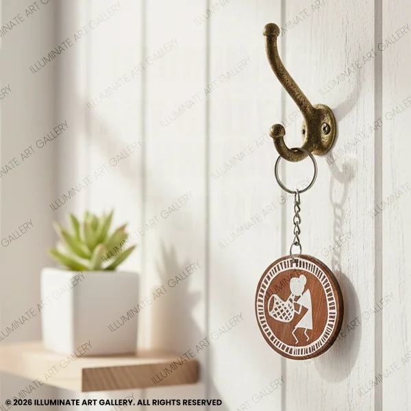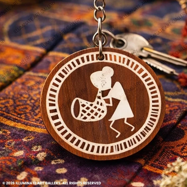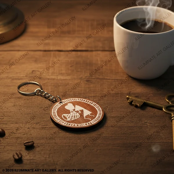 Inspired by Indian tribal village life, this hand-painted wooden keychain features a woman — a symbol of strength, care, and everyday beauty.